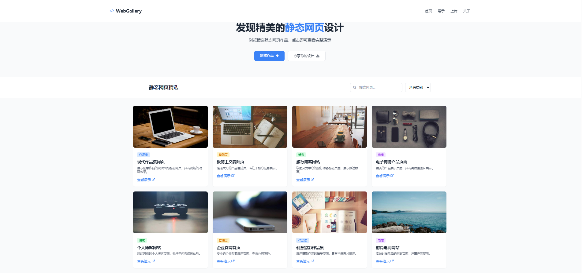 WebGallery 是一个专注于静态网页设计展示的轻量级平台,采用响应式设计,适配桌面与移动端设备。平台以“发现精美静态网页设计”为核心定位,通过结构化布局与交互功能实现作品展示、筛选、上传及社区交流功能。