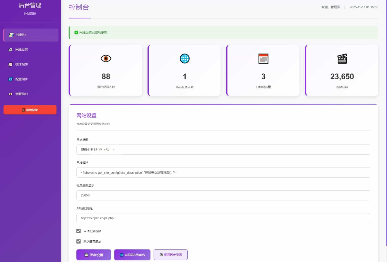 随机美女热舞全新UI带后台版4.0,自适应PC与移动端。内置2025年超2万部最新美女热舞视频,本地化高速播放。全新UI设计,后台功能强大,可配置网站、统计数据,提供稳定流畅且易管理的视频平台。