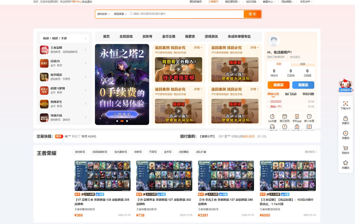 此全开源网络游戏账户交易平台系统,全新UI设计,涵盖用户、交易、搜索等多功能体系,提供安全保障与丰富运营内容,适配移动端,具备合规备案与SEO优化,适用于专业虚拟物品交易场景。