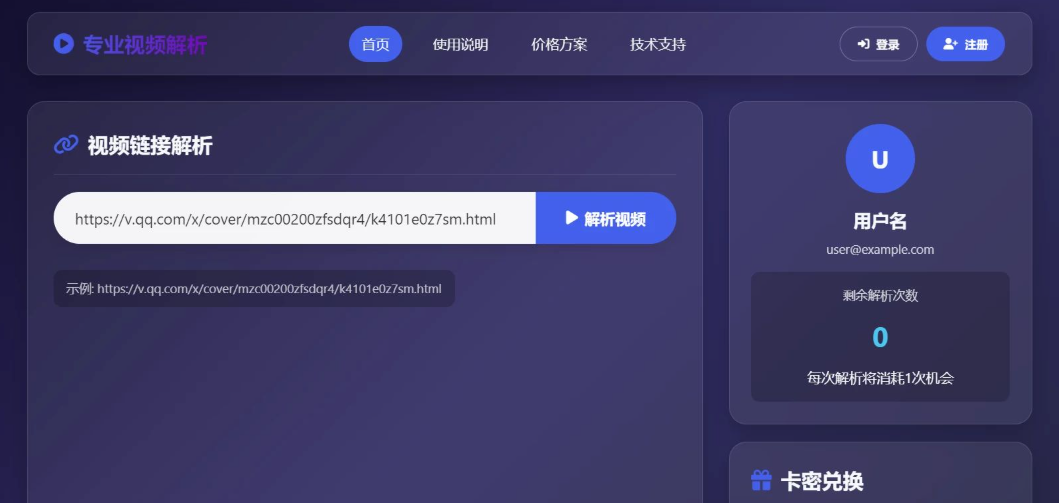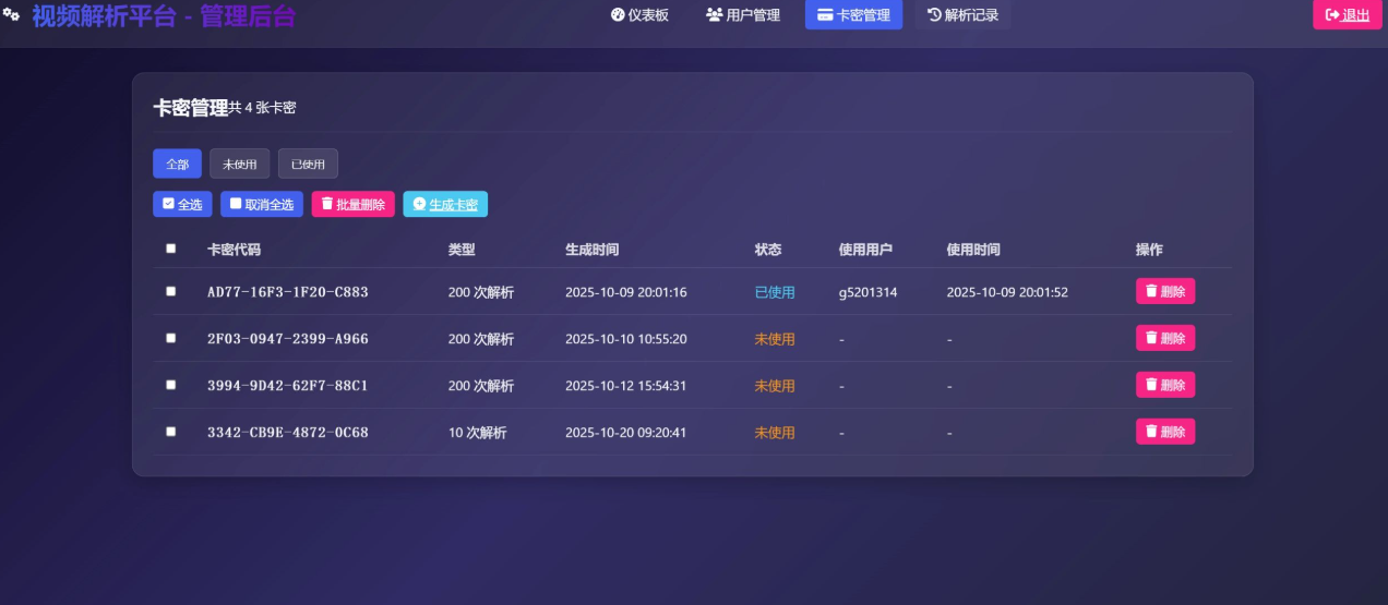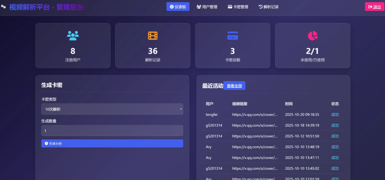 该系统是一个功能完备的视频解析服务平台,涵盖用户前端与管理后台两大核心模块。用户前端支持多视频平台链接解析、在线播放、下载,且针对移动端进行优化;管理后台具备系统统计、卡密管理、用户管理以及解析记录监控等功能。系统采用 JSON 文件存储数据,无需搭建数据库,部署简便,支持批量操作与实时数据同步,拥有现代化 UI 设计并适配移动端。新用户注册可获赠 5 次解析机会,卡密系统支持灵活多样的计费策略。