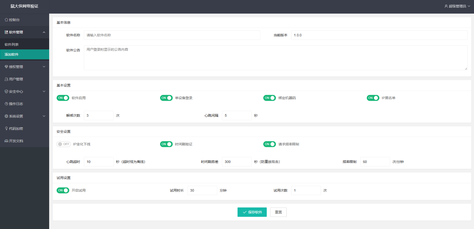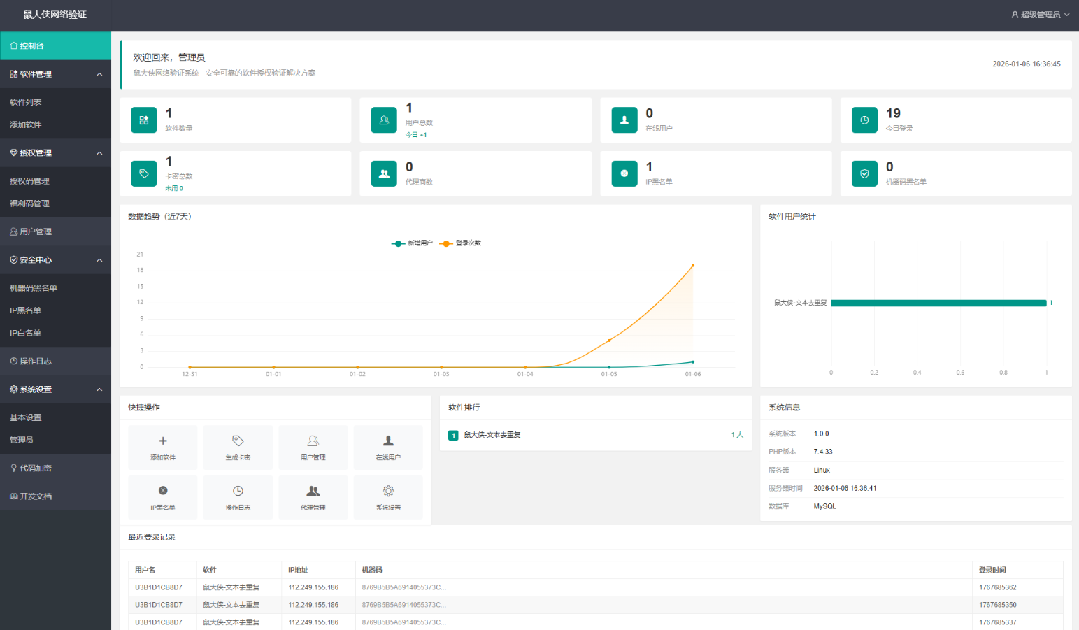 鼠大侠网络验证系统是一套轻量级的软件授权验证解决方案,专为软件开发者量身打造。该系统采用PHP+MySQL架构,集成了多种强大功能,包括一机一码授权、福利码激活、试用功能、心跳检测等,助力开发者轻松实现软件的授权管理与防破解保护。