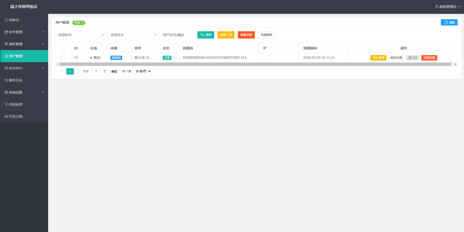 - 机器码管理:实现机器码的封禁与解封,并可一键踢下线违规用户。