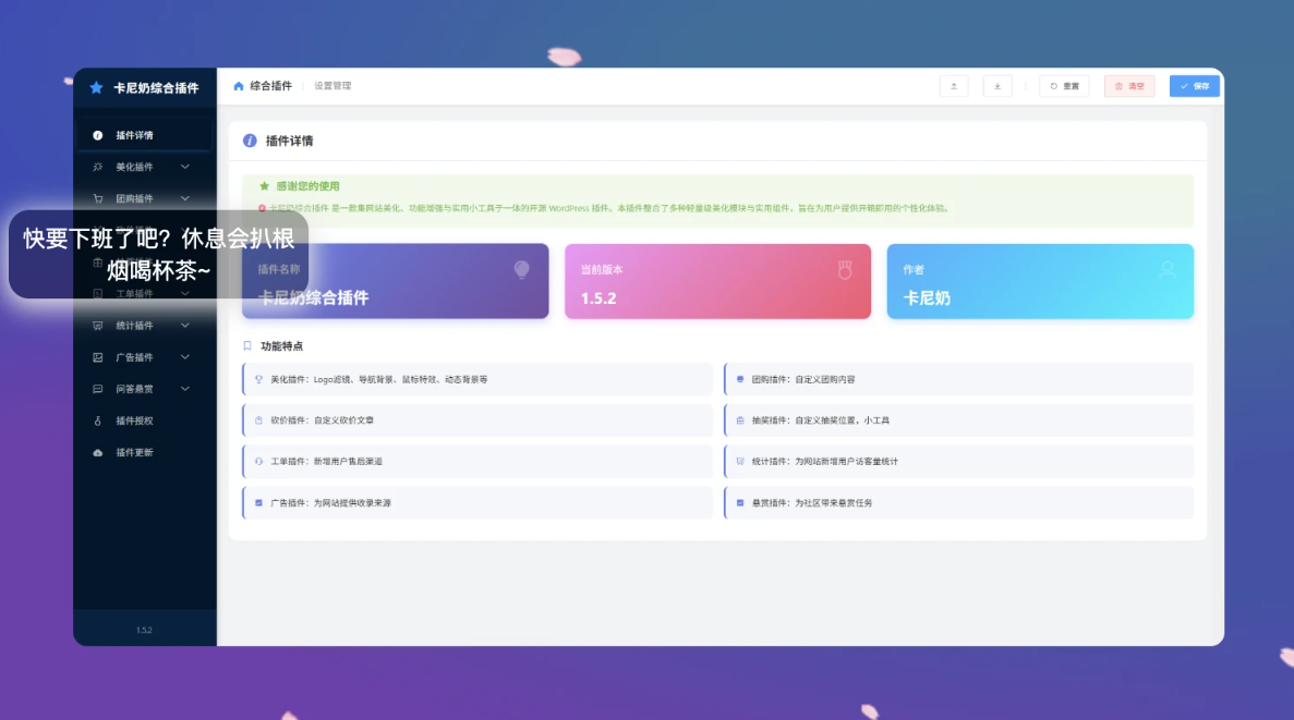 这款综合插件并非简单功能堆砌,而是针对子比主题深度优化与扩展,主要由以下八大核心模块组成: