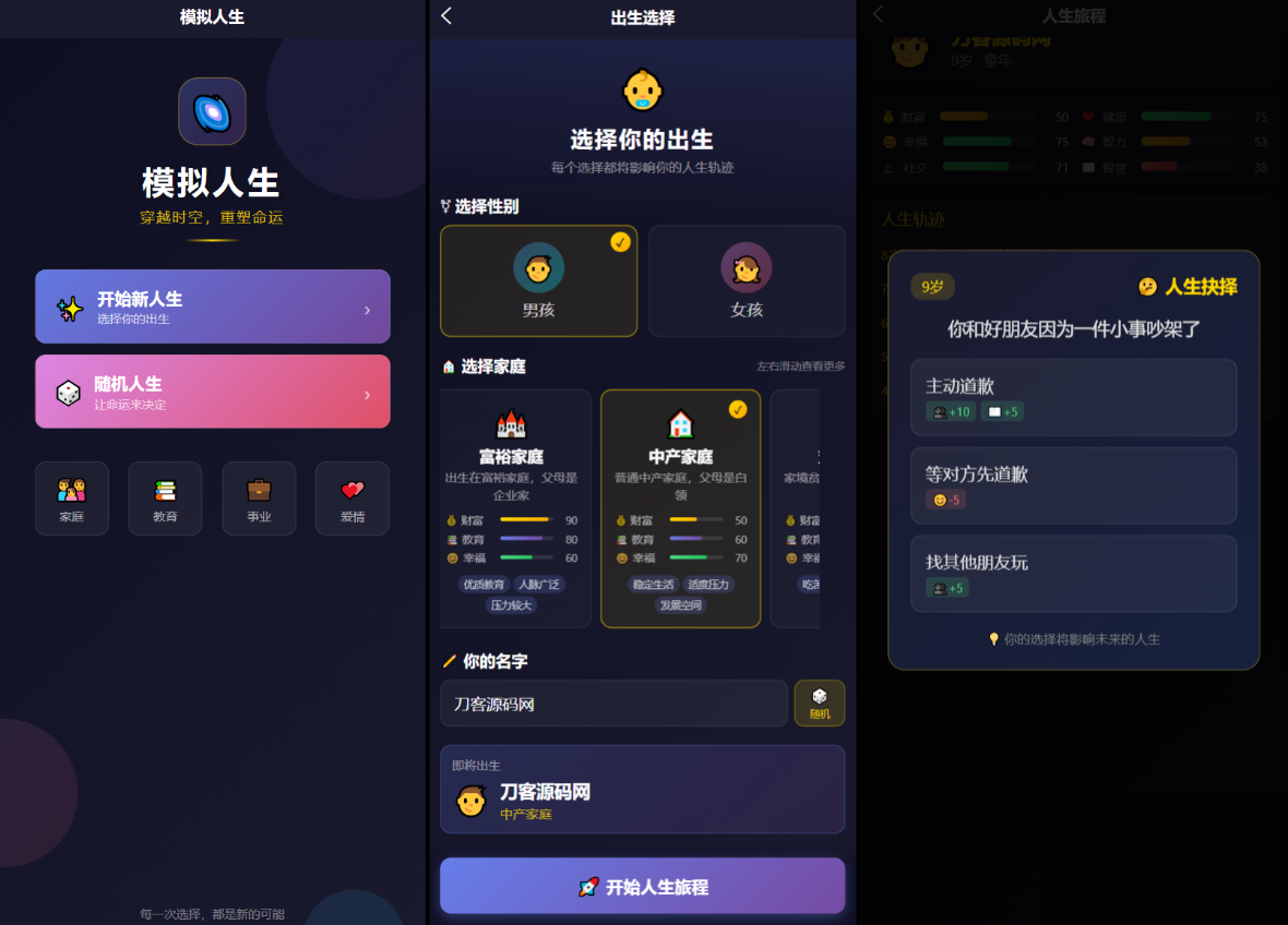 这是一个 轻量级但完整的人生模拟游戏,玩家可以通过选择不同的起点,体验不同的人生轨迹,最终获得个人化的生命总结。
