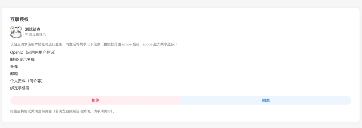 - 默认 scope 设置:每个接入站点可设置默认授权范围,未传 scope 时自动使用。