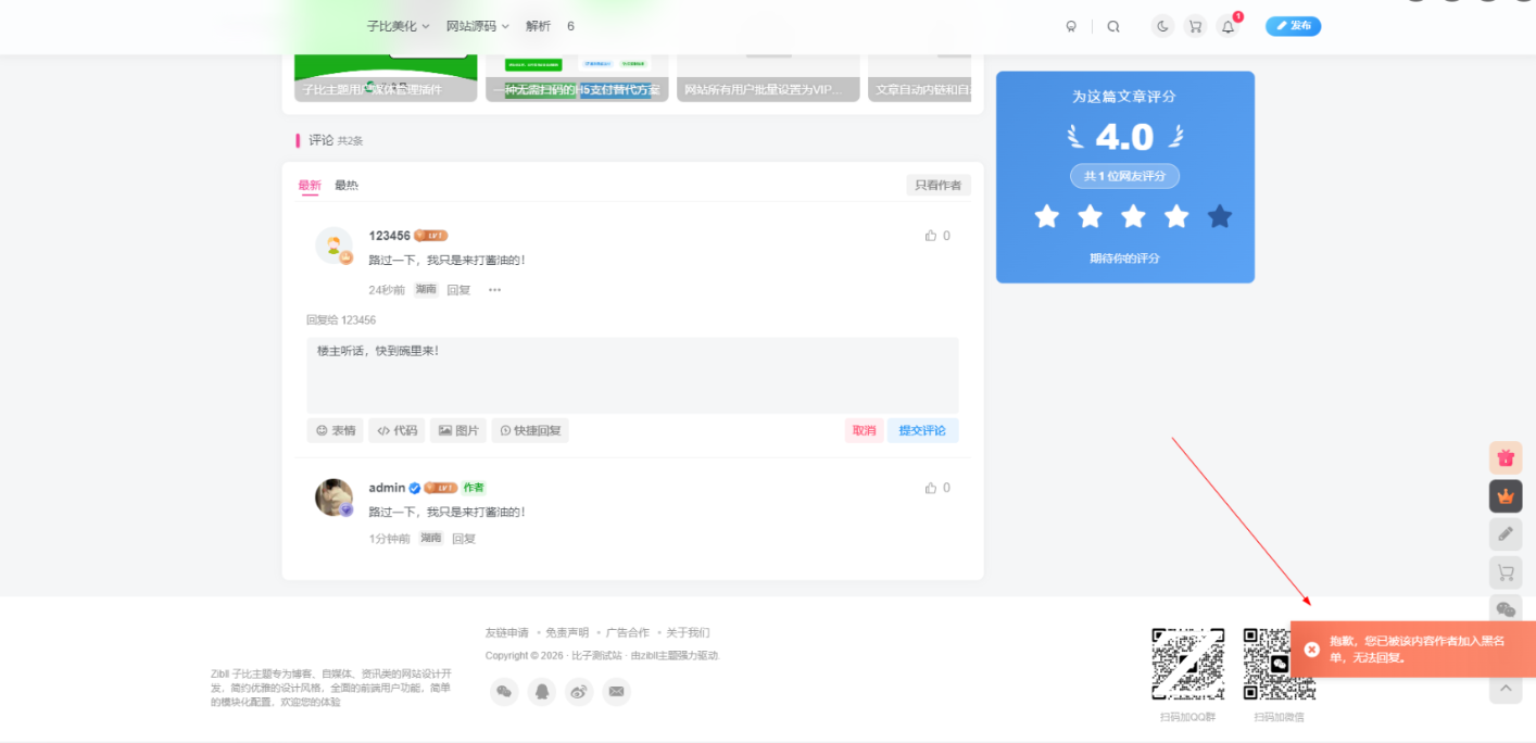 这是一款专为子比主题设计的文章/帖子评论区拉黑插件,主要功能特点如下: