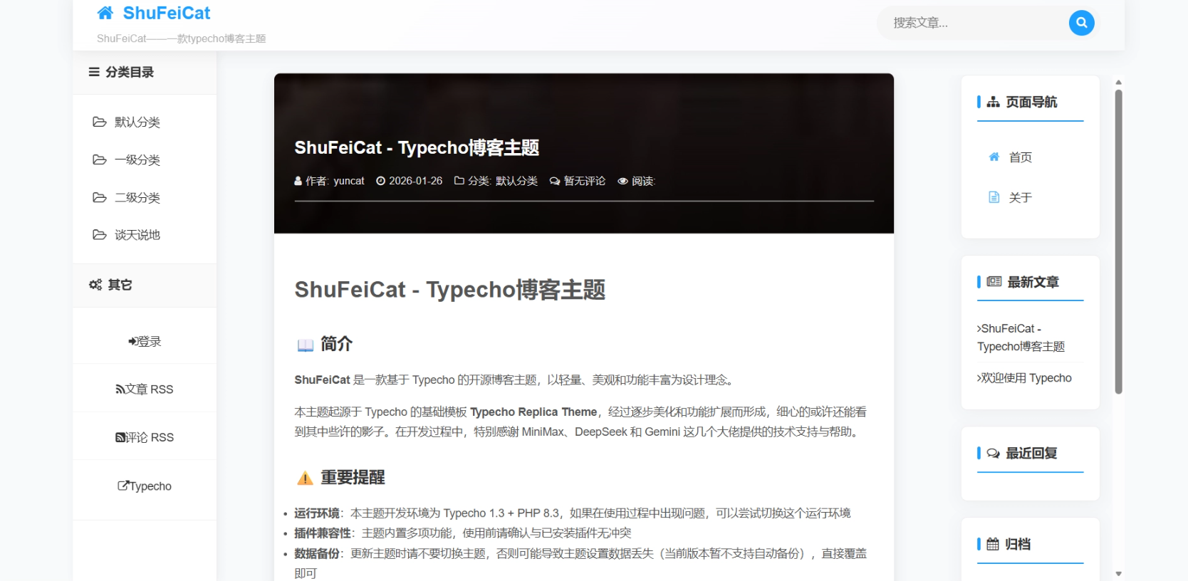 ShuFeiCat 是一款基于 Typecho 的开源博客主题,专为追求轻量、美观与多功能的博主设计。该主题在保持仅 200KB 的轻量级架构下,集成了大量实用功能,包括免插件友情链接展示、内置代码高亮、AI 智能评论审核、邮件自动通知及 Turnstile 防机器人验证等。