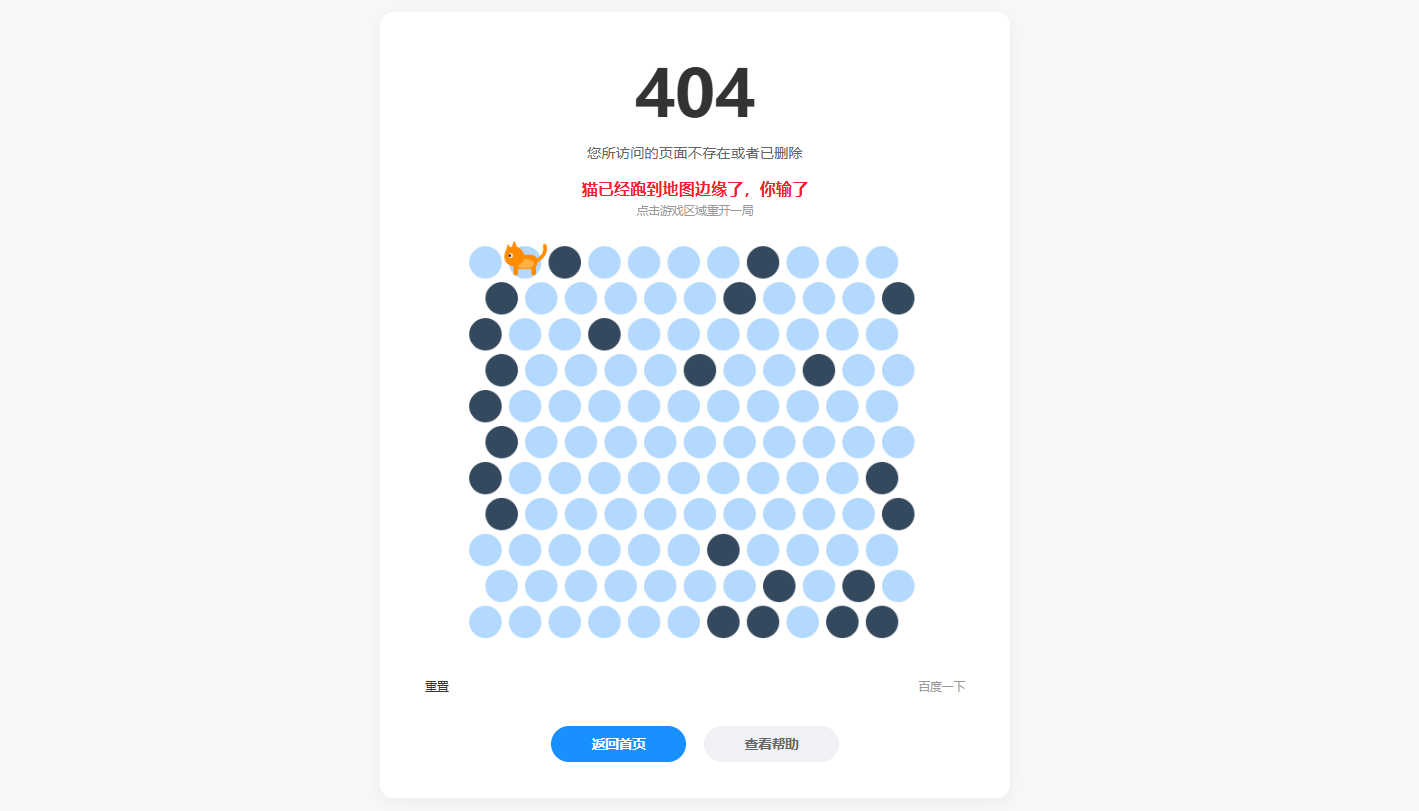 这是一个创意十足的404页面小游戏,它将“围住小猫”的经典玩法嵌入其中,让访客在遇到页面丢失时也能获得片刻放松。