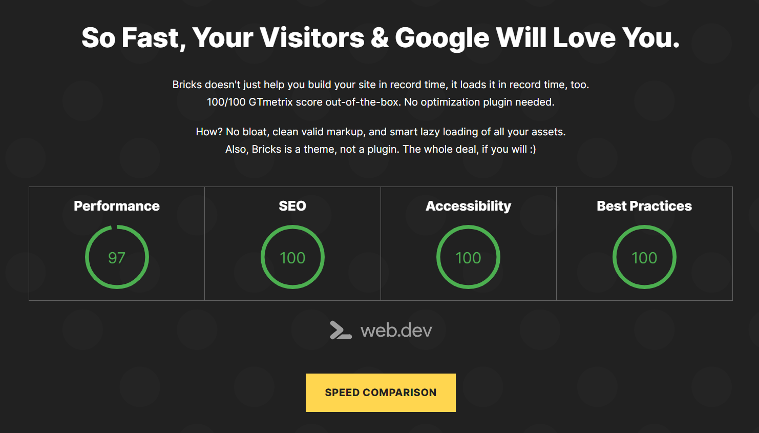 - 快速加载:不仅能帮助您在创纪录时间内构建网站,还能让网站在创纪录时间内完成加载,开箱即用即可获得 100/100 GTmetrix 分数,无需优化插件。这得益于无臃肿、干净有效的标记以及所有资源的智能延迟加载。