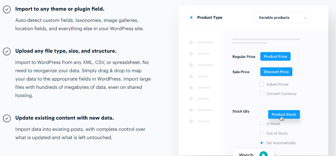 - 支持多样文件类型:可上传任何文件类型、大小和结构,能从任何XML、CSV或电子表格导入到WordPress。无需重新组织数据,通过拖放就能将数据映射到WordPress中的相应字段。即使在共享主机上,也能导入包含数百兆字节数据的大型文件。