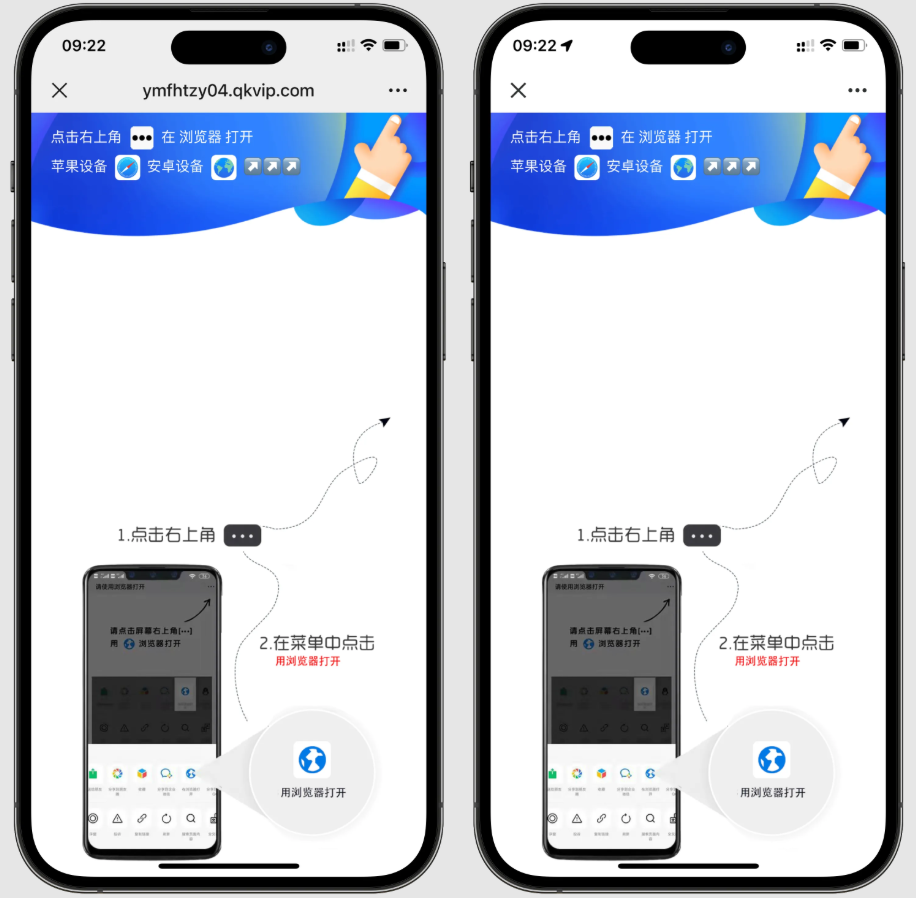 - 针对苹果和安卓设备分别展示对应的浏览器图标提示,覆盖主流移动端。