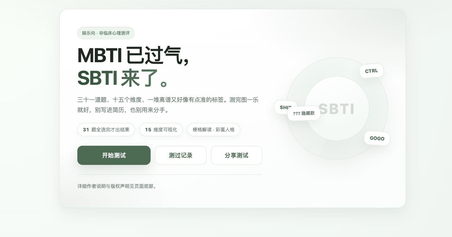 SBTI 人格测试,含 31 道常规题与 2 道特殊题,随机排序。测试后生成 26 种网络文化人格结果,有隐藏机制与兜底人格。支持多设备,纯前端代码易部署,适合社群互动、引流,快来测测你的独特人格!