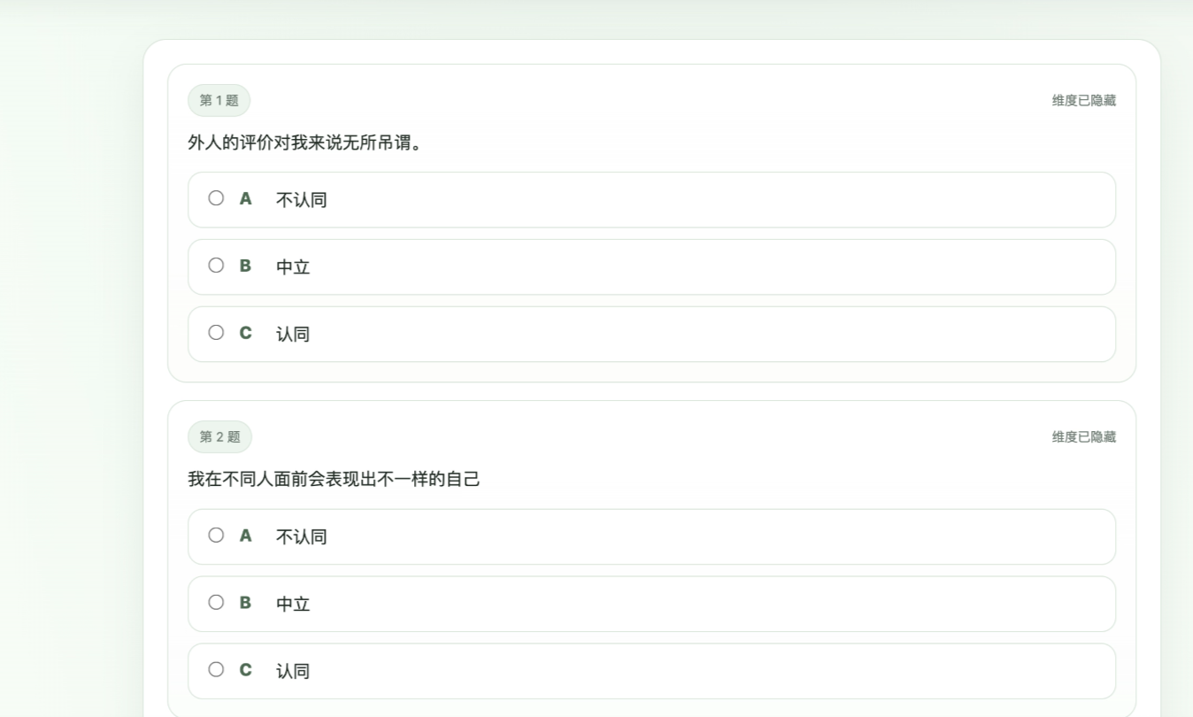 - 题目设置:包含 31 道常规维度题 + 2 道特殊触发题(兴趣与饮酒态度),题目随机排序,每次测试体验不同。