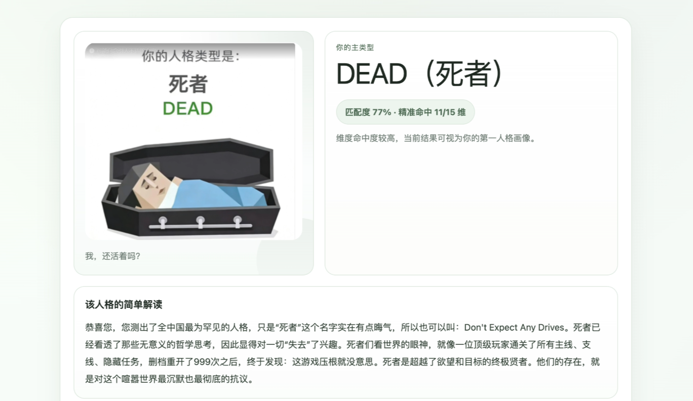 - 兜底人格:当常规匹配相似度低于 60% 时,系统强制分配傻乐者(HHHH),避免结果落空。