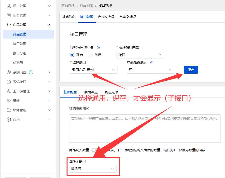 - 在“接口管理”中先选择“通用产品”接口并保存,之后下方会显示子接口对接选项内容,后续可自行完成配置使用。