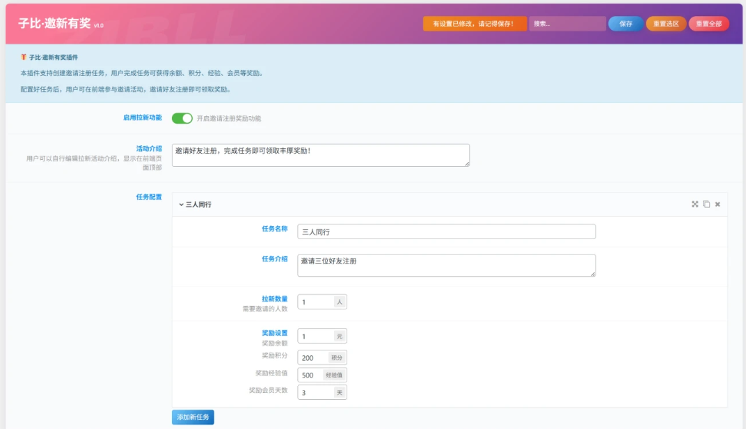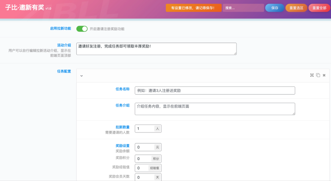 该插件为子比主题定制开发,实现用户邀请注册奖励功能,支持管理员后台配置拉新任务,用户前端参与活动并领取奖励。主要功能如下: