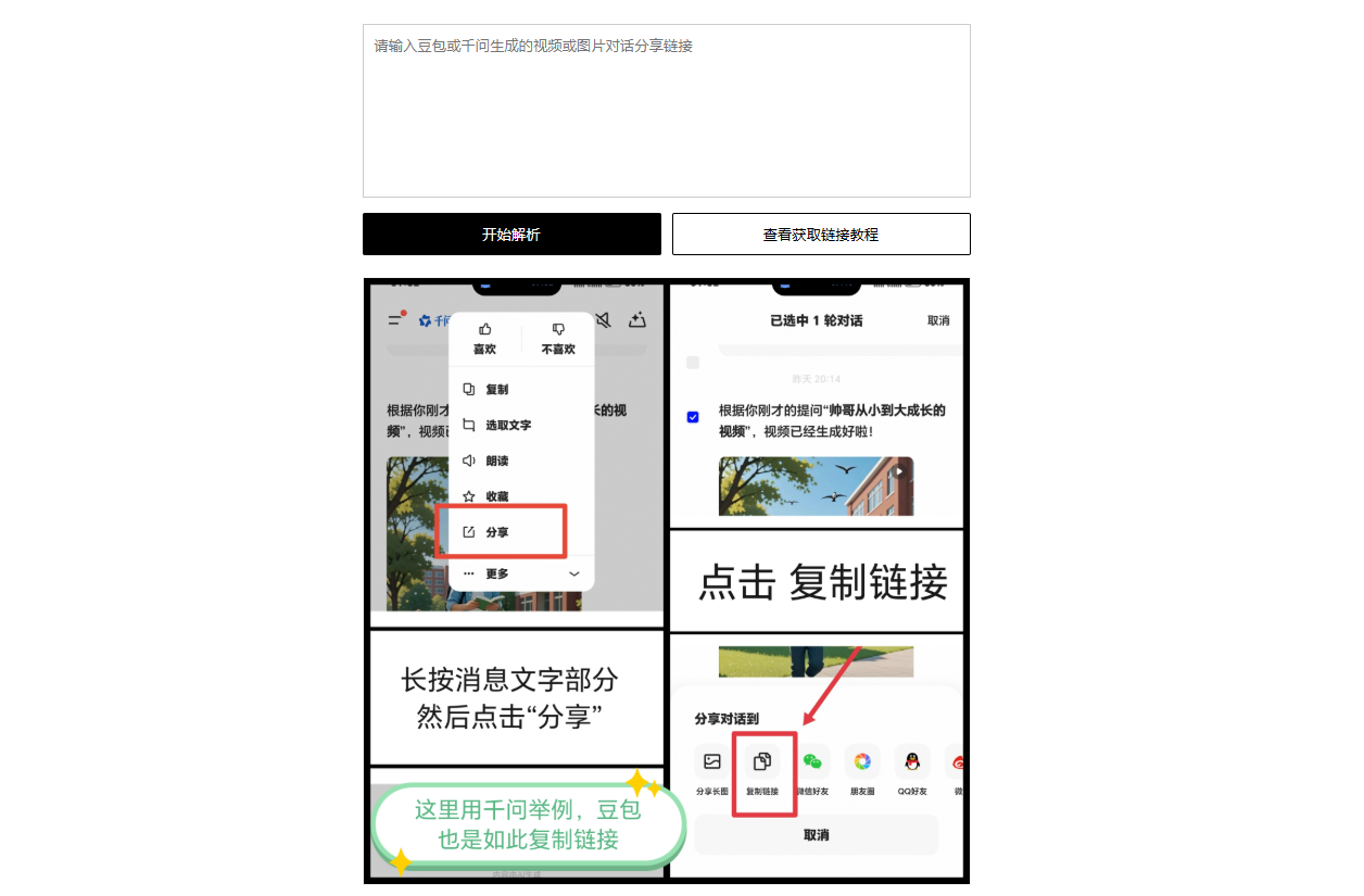 - 平台支持限定:目前仅兼容豆包(doubao.com)和千问(qianwen.com)生成的视频/图片对话分享链接,其他平台链接会被拒绝解析。