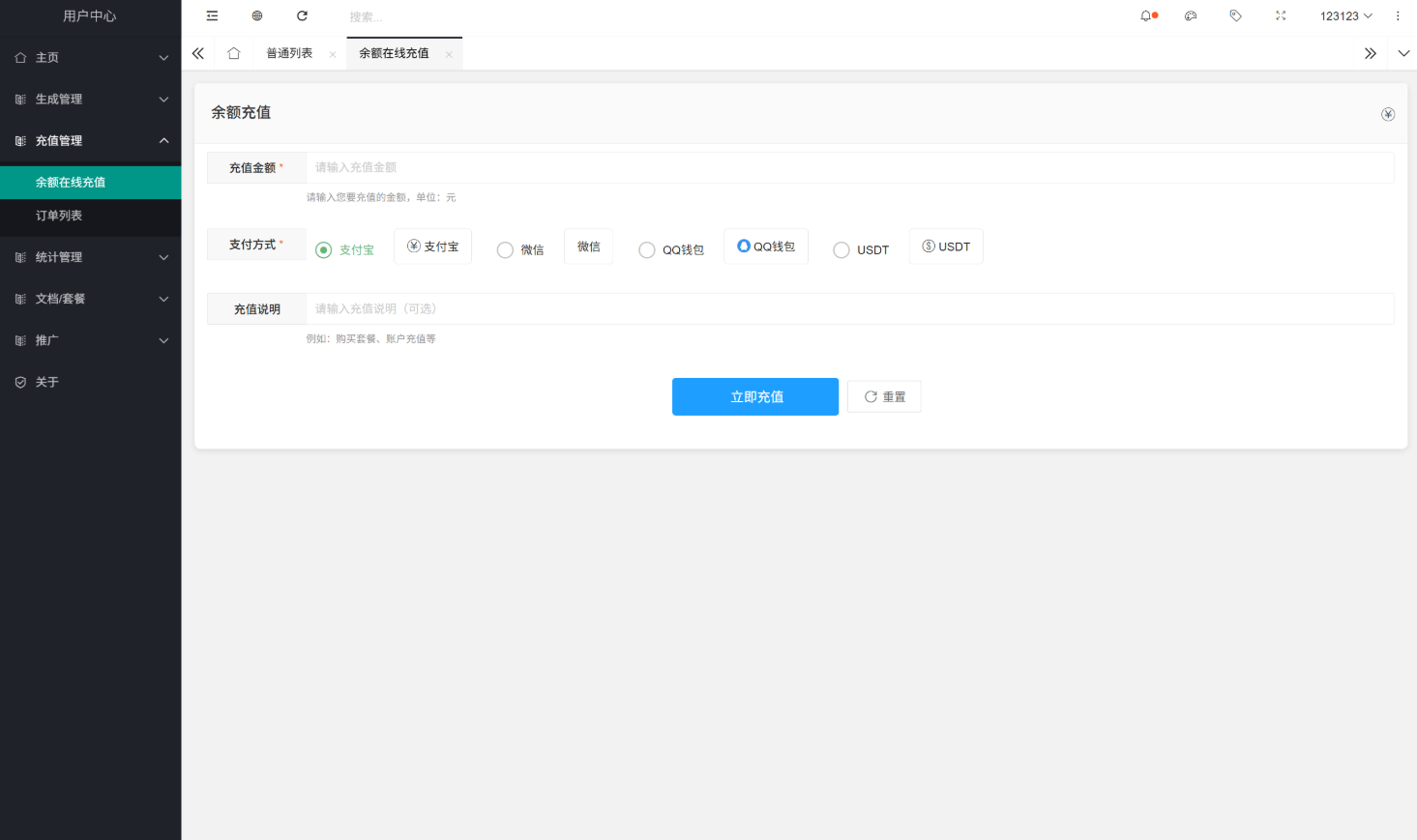 - 余额在线充值(支持支付宝、微信、QQ、USDT等多种支付方式)