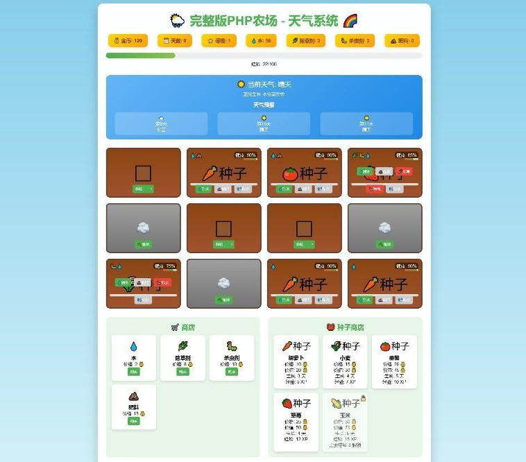 解压即玩的PHP单机农场游戏!无需数据库,数据保存在浏览器。支持动态天气、宠物防盗、自然灾害防御,种植小麦/西瓜等作物,使用水壶/肥料加速生长。复古界面+极简部署,适合怀旧玩家轻松体验田园生活!