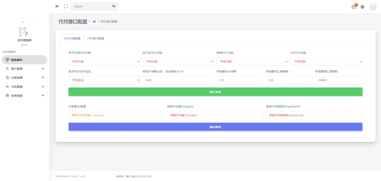 - 充值接口集成:余额充值接口集成易支付、微付、码支付、官方通道。