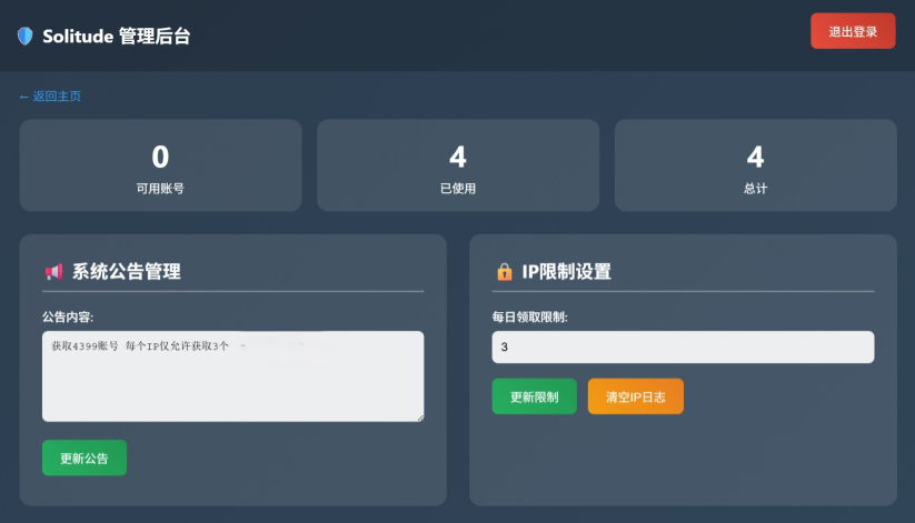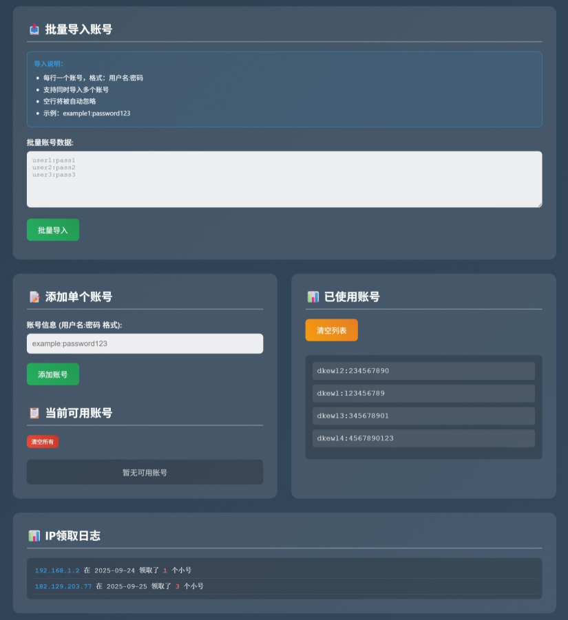 此源码为小号分发卡密系统,适用于分发小号库存账号或卡密。系统设定每个IP仅限领取3次,亦可作为小号分发工具使用。