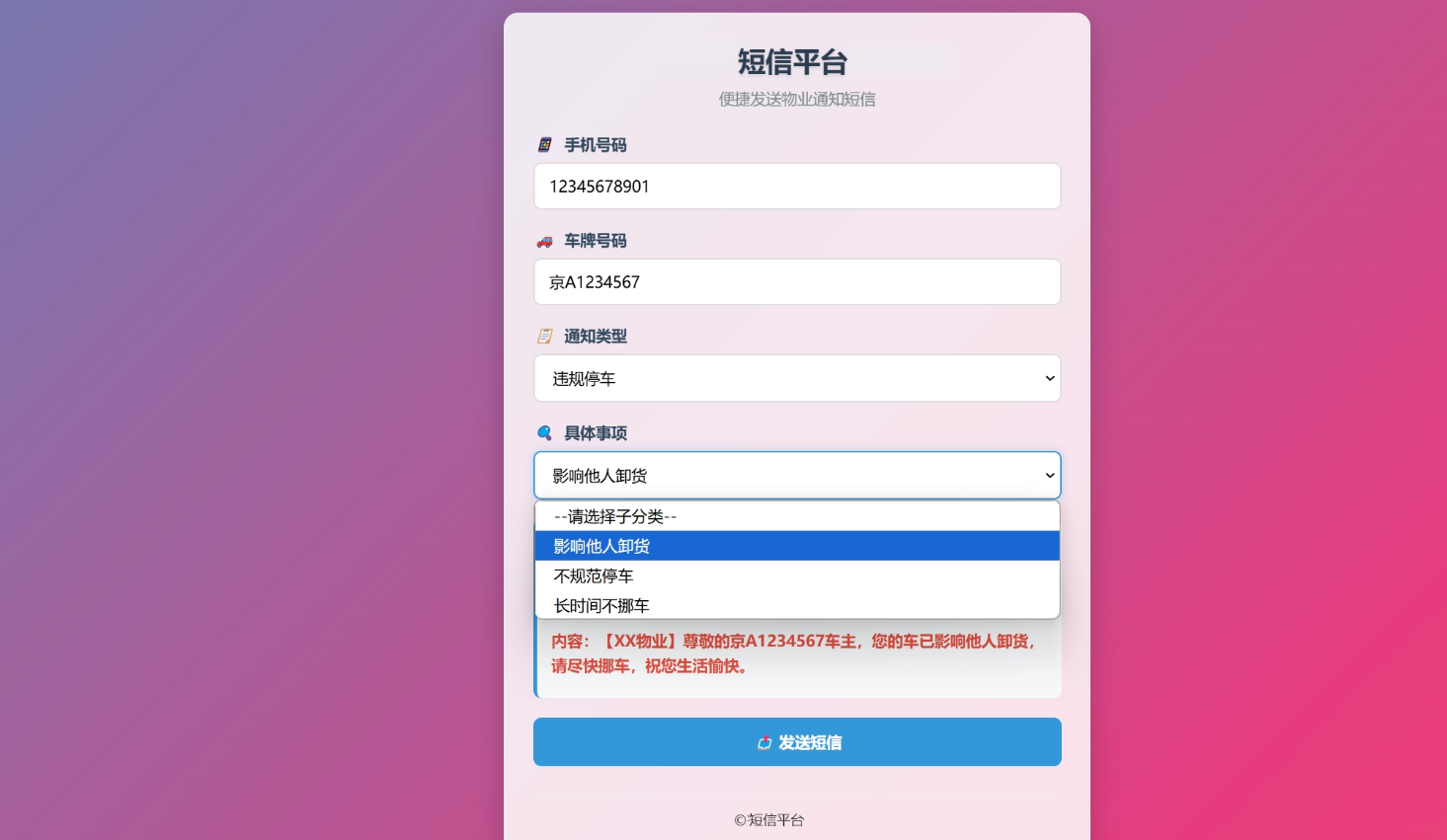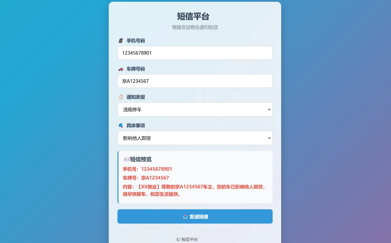此纯HTML单页物业管理短信发送系统,支持自定义公司名与短信模板报备。集成短信宝接口,操作简单,双击index.html即可用浏览器打开,能快速向车主发送月卡、挪车等各类通知,提升园区车辆管理效率。