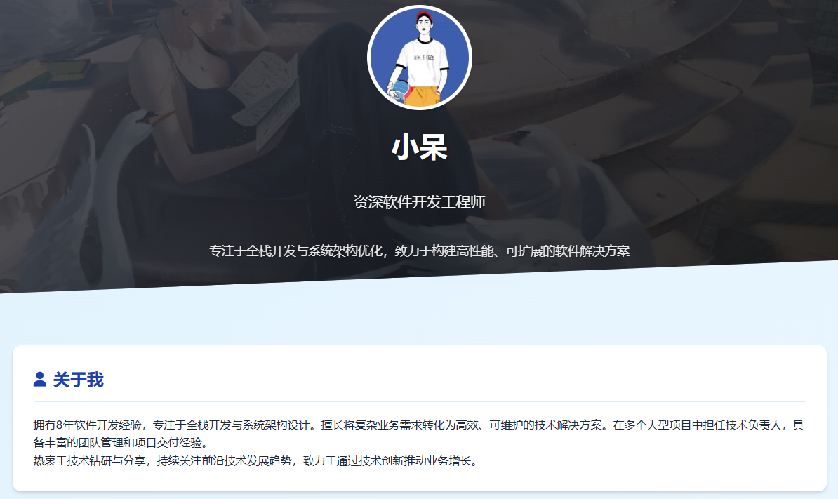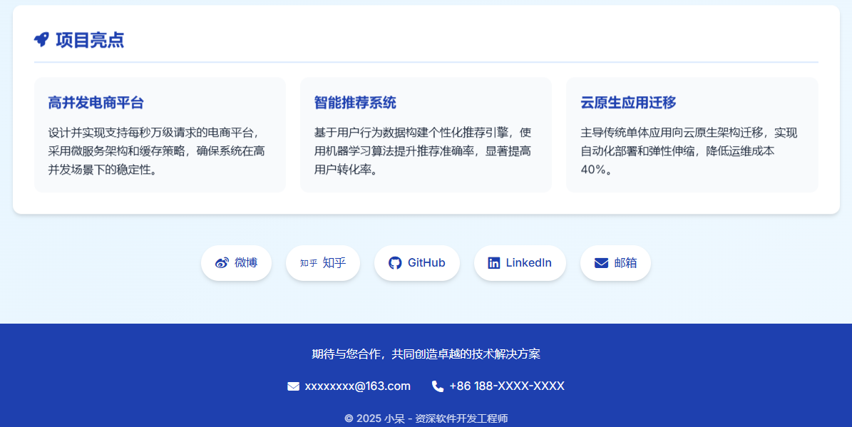 此单页HTML响应式软件开发个人页面,以专业蓝白配色搭配深浅蓝渐变,彰显技术专业可靠。融合圆角与阴影,层次分明又亲和。技能导向布局突出技术栈,时间线与项目亮点模块,清晰呈现职业轨迹与技术实力。