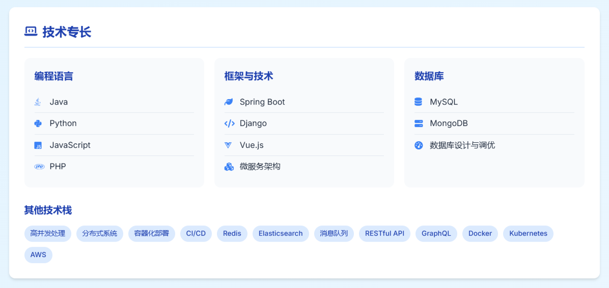 - 技术栈展示置于显眼位置,突出核心竞争力