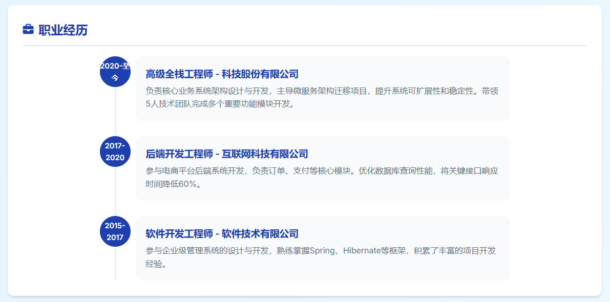 - 时间线功能:清晰展示职业发展轨迹,提升可信度