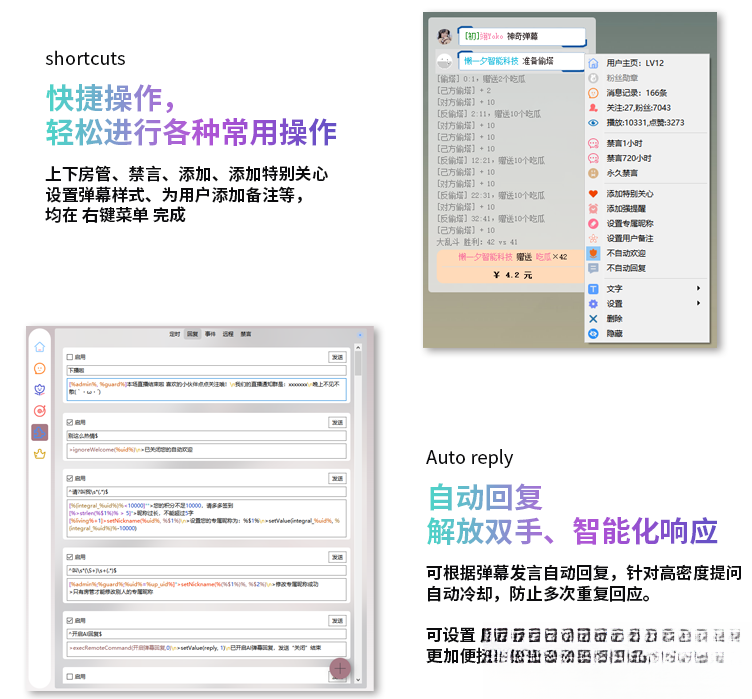 本程序以打造自动化直播间为核心,以建设高粘性粉丝团体为目标,在保持观众互动、实现粉丝裂变、打造直播高峰的同时,规范观众行为秩序,促进直播产业健康有序发展,营造清朗网络环境,做有温度的直播助手。