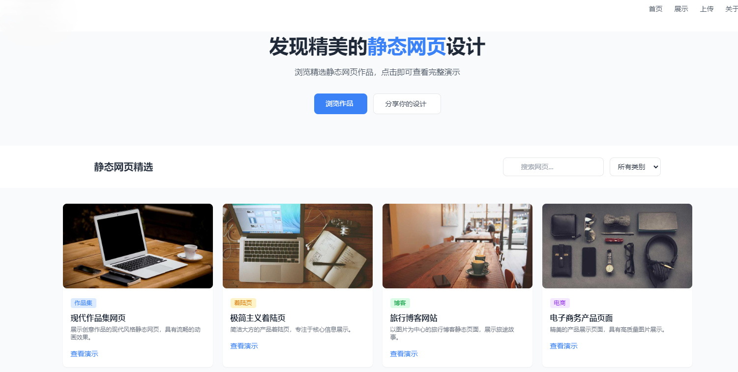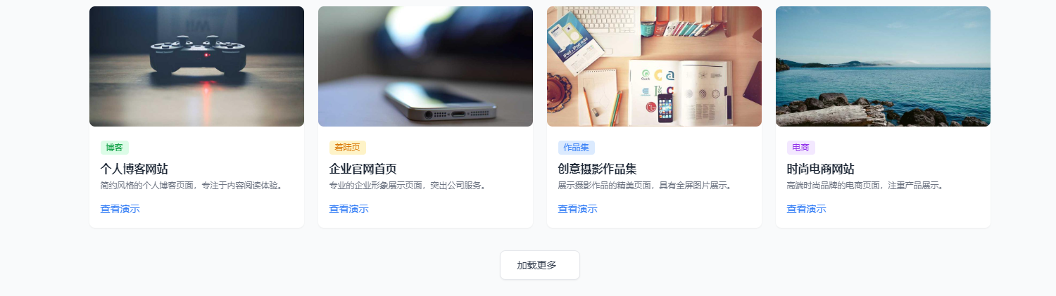 - 展示区:集中展示所有静态网页作品,支持筛选、搜索与加载更多功能。