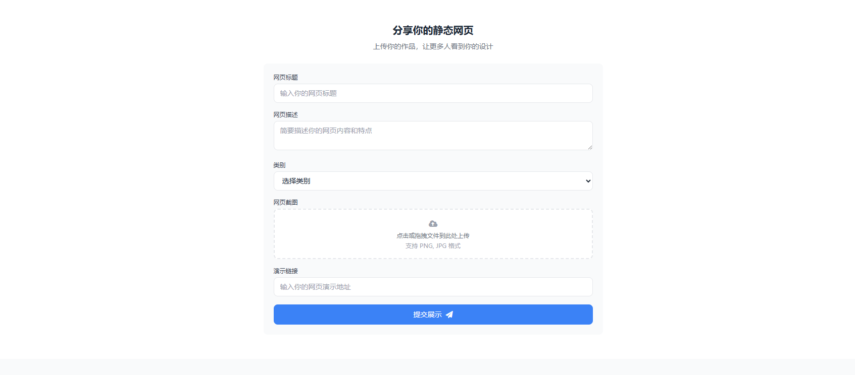 - 包含上传功能,允许用户提交自己的静态网页作品,丰富平台内容。