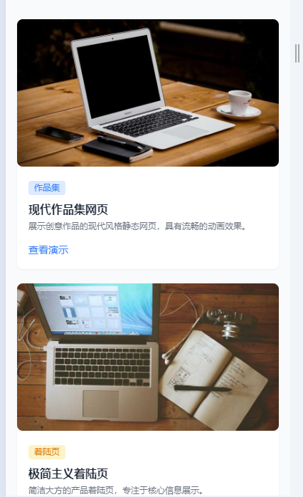 - 以卡片形式展示静态网页截图,每张卡片附带类别标签,方便用户快速识别作品类型。