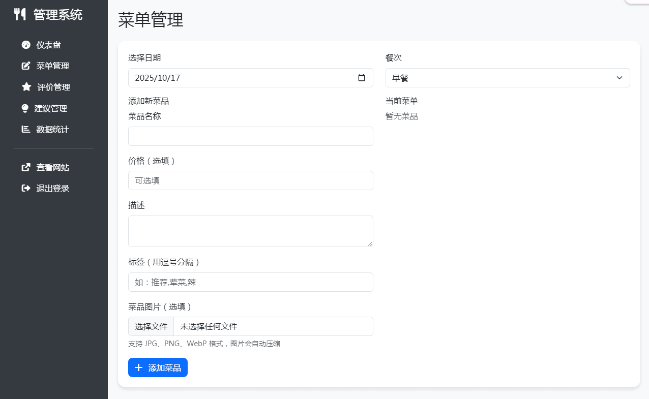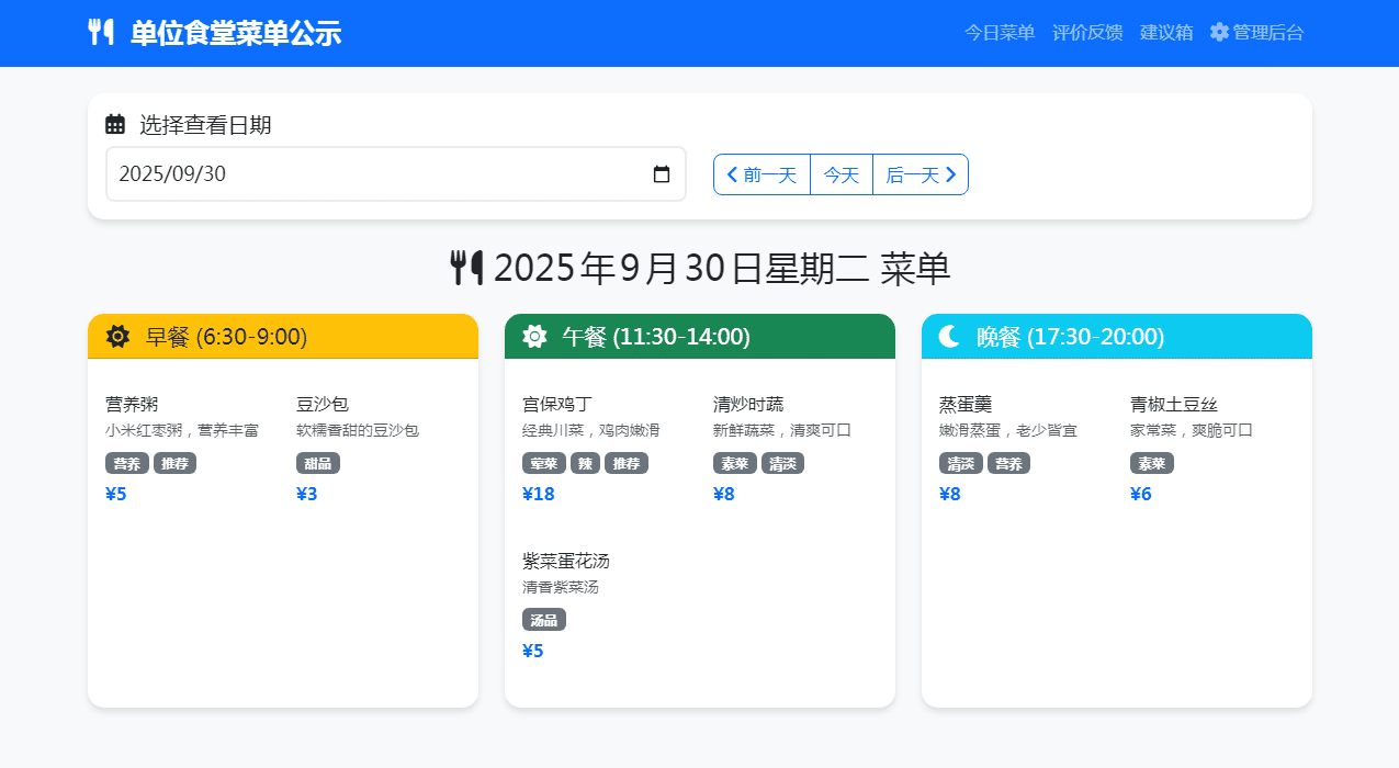 为解决单位人员或学校等提前了解食堂菜谱难题,虽不专业可能存问题,如数据库设置未达预期。现分享出来,盼有能者一同完善,实现订餐打包预订功能,接受建议与问题反馈,共筑便捷就餐。