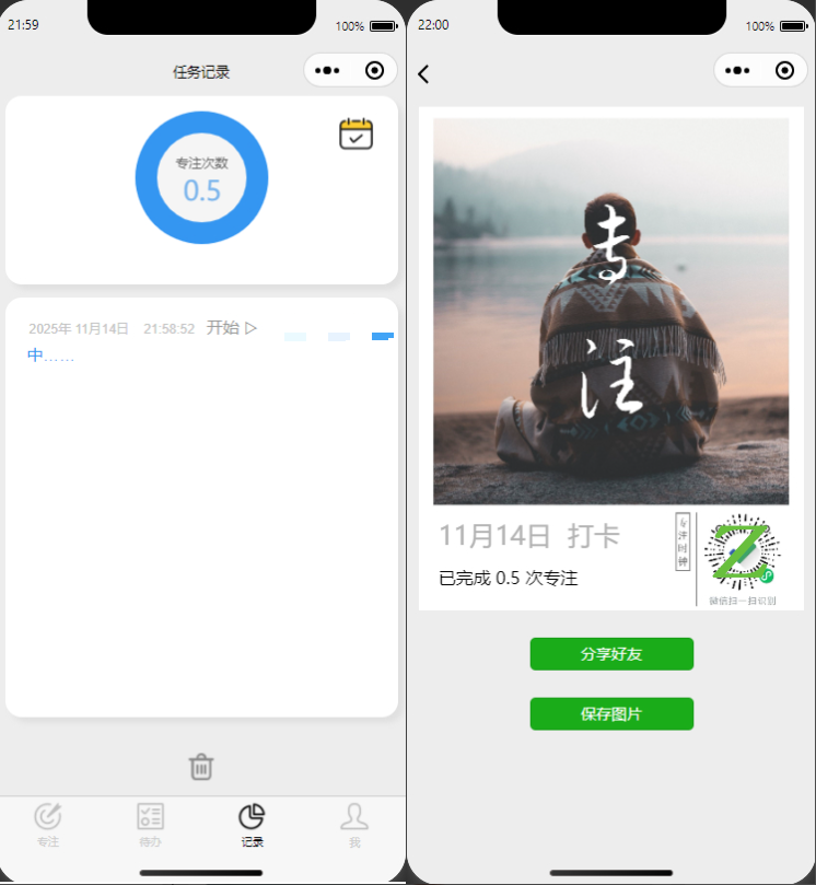 - 专注计时:基于番茄工作法,支持自定义专注时长