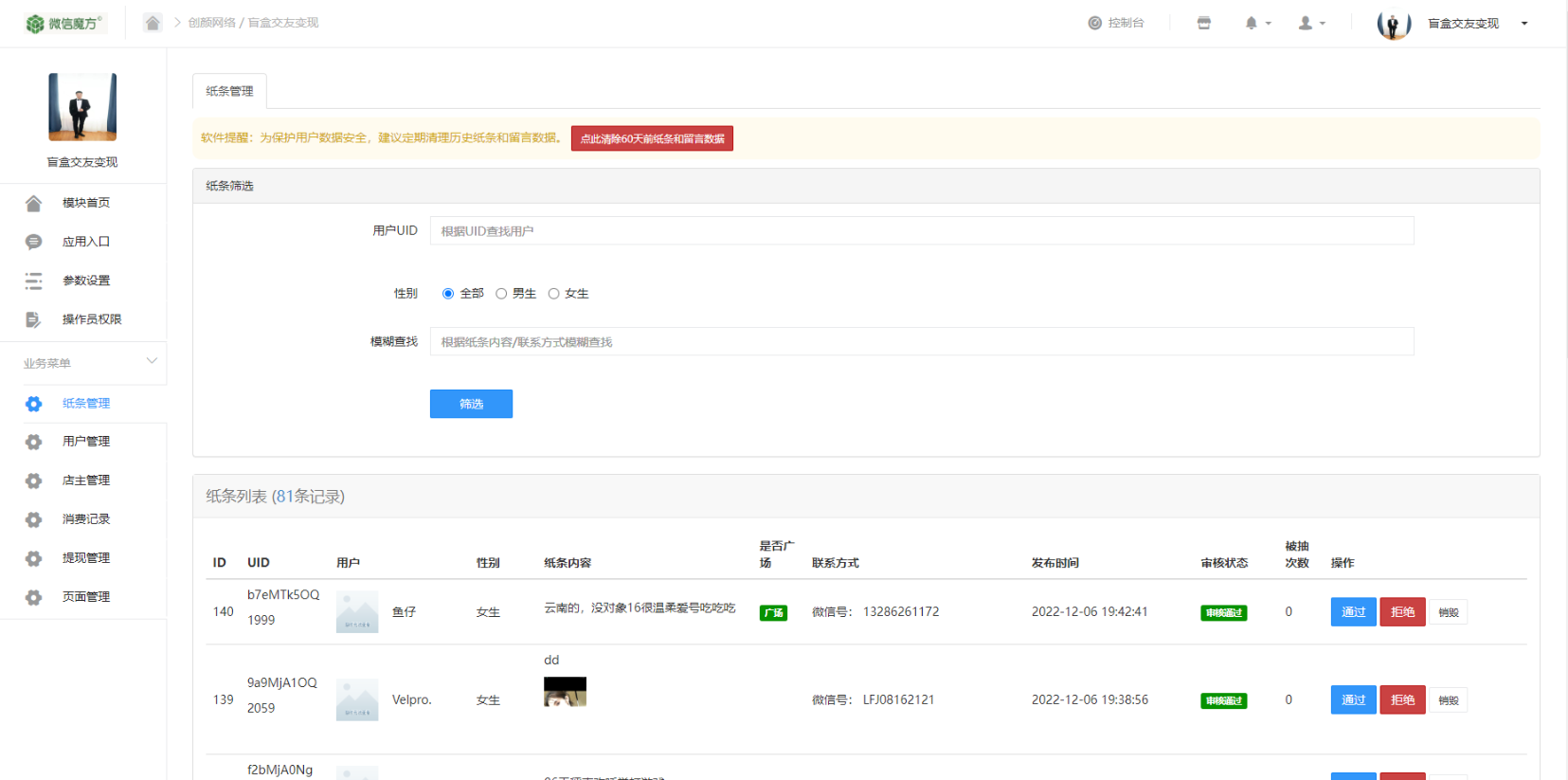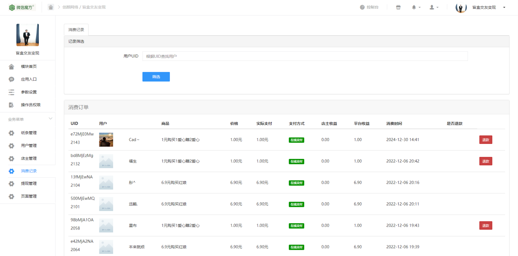 H5恋爱交友盲盒系统是基于微擎框架开发的微信社交应用,支持男女用户投放微信联系方式盲盒、分销功能、易支付三方支付接入等功能。